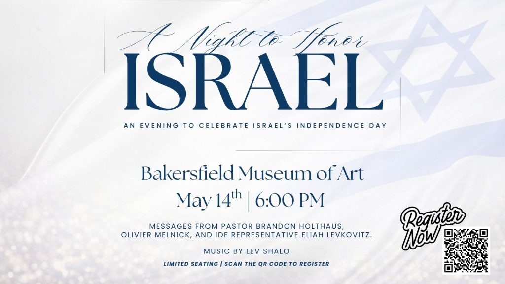 Join us for a special evening as we celebrate the 78th anniversary of Israel’s independence. This night will include a kosher meal, worship led by Lev Shelo, and messages from guest speakers including Pastor Brandon Holthaus, Olivier Melnick, and IDF representative Eliah Levkovitz.