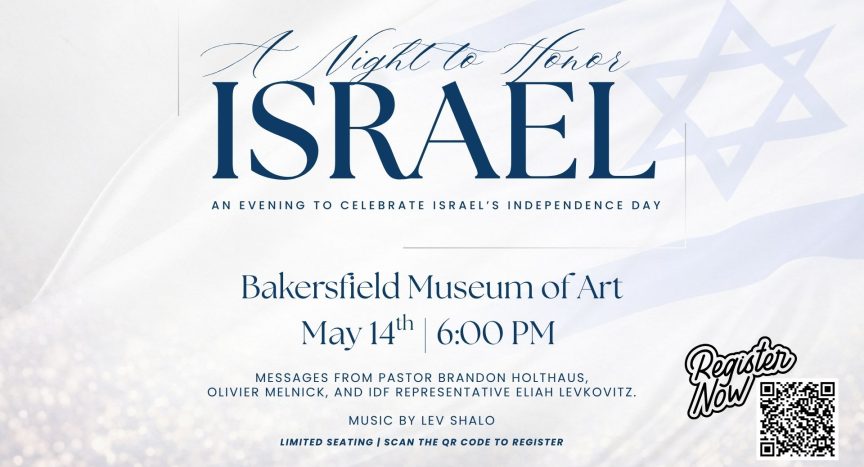 Join us for a special Night to Honor Israel on May 14th as we celebrate the 78th anniversary of Israel’s independence. This meaningful evening will be a time of fellowship, encouragement, and solidarity as we gather with members of local synagogues to express our love and support for the Jewish community. The evening will include a kosher meal, worship led by Lev Shelo, and messages from guest speakers including Pastor Brandon Holthaus, Olivier Melnick, and IDF representative Eliah Levkovitz. We will also take time to bless our Jewish guests with a special gift as a tangible expression of our support. Come be part of this powerful evening as we stand together, united in support of Israel and the Jewish people, with a shared spirit of hope and encouragement. Seating is limited. Register today! Click HERE.