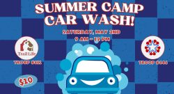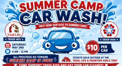Join us on Saturday, May 2 from 9:00 AM to 12:00 PM for a car wash here at the church. Cost is $10, and all proceeds go toward summer camp in June for both groups. Trail Life will be selling tickets between services on Sunday, April 19, and Frontier Girls will be selling tickets on Sunday, April 26. Come support these kids and get your car cleaned!