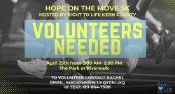 Join us in partnering with Right to Life Kern County for their Hope on the Move 5K on April 25th from 8:00 AM to 2:00 PM at The Park at Riverwalk. They are looking for 15 to 20 volunteers to help with setup and check-in, course support, finish line assistance, and traffic and vendor direction. To sign up, email executivedirector@rtlkc.org or text 661-864-7508. A required Zoom meeting will take place on April 23rd.