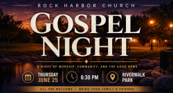 Join us for a special evening of worship, a clear gospel message, and a time of prayer at Riverwalk Park on Thursday, June 25 from 6:30 to 8:30 PM. This evangelistic event is designed to share the hope of Jesus Christ in a welcoming outdoor setting. We encourage you to invite friends, family, and anyone the Lord has placed on your heart. Come expectant as we gather for gospel-centered music, the preaching of God’s Word, and an opportunity to respond in faith. Let’s come together as a church family to reach our community with the good news of Jesus Christ.