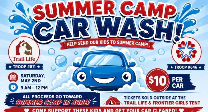 Join us on Saturday, May 2 from 9:00 AM to 12:00 PM for a car wash here at the church. Cost is $10, and all proceeds go toward summer camp in June for both groups. Trail Life will be selling tickets b...