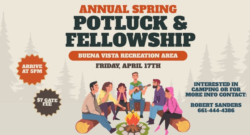 Church Spring Fellowship Friday, April 17th at Buena Vista Recreation Area . Potluck and fellowship. Arrive at 5pm $7 gate fee. If interested in camping or for more info contact Robert Sanders 661-444-4386.