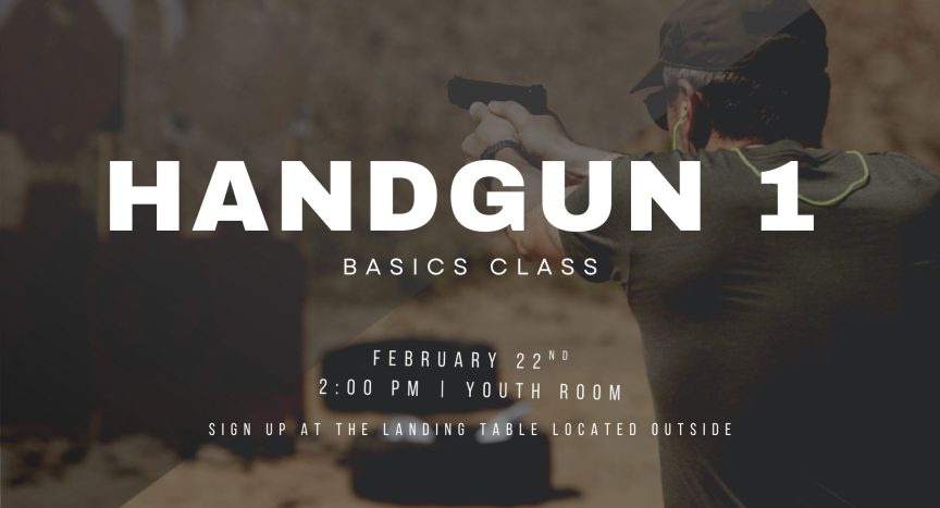 Handgun 1 (Basic) will be held on February 22 at 2:00 PM in the Youth Room. This class is lecture only and is required for those continuing on to future handgun training. To sign up, visit The Landing table located outside.