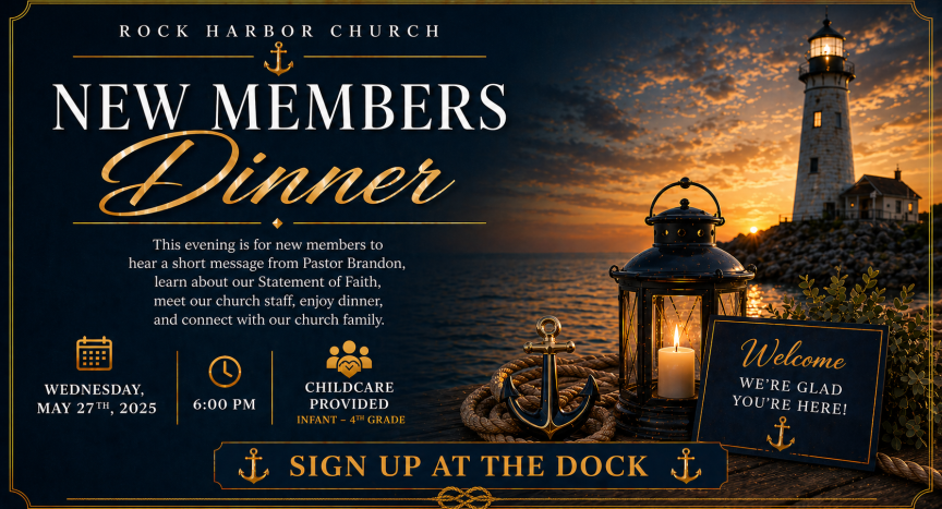 Join us Wednesday, May 27th at 6:00 PM for our New Members Dinner. This evening is for new members to hear a short message from Pastor Brandon, learn about our Statement of Faith, meet our church staff, enjoy dinner, and connect with our church family.