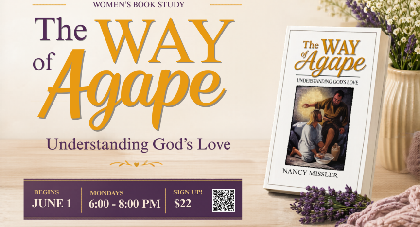 Join us for a 5-week study of The Way of Agape by Nancy Missler, beginning Monday, June 1 at 6:00 PM. This study explores God’s unconditional, selfless love and how believers are called to live it out daily. Through biblical teaching and practical application, you’ll be encouraged to walk in grace, extend forgiveness, and experience the freedom that comes from abiding in Christ. Come grow deeper in your understanding of agape love and what it means to reflect Christ in every area of life. The cost is $22 and includes your book. Register HERE