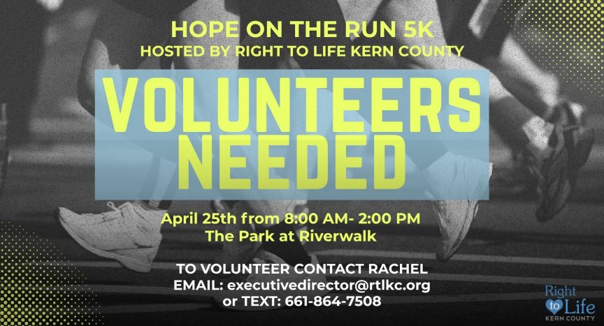 Join us in partnering with Right to Life Kern County for their Hope on the Move 5K on April 25th from 8:00 AM to 2:00 PM at The Park at Riverwalk. They are looking for 15 to 20 volunteers to help with setup and check-in, course support, finish line assistance, and traffic and vendor direction. To sign up, email executivedirector@rtlkc.org or text 661-864-7508. A required Zoom meeting will take place on April 23rd.