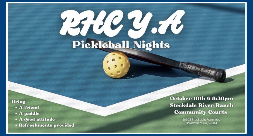 Join us Friday, October 18th at 6 PM for a fun evening of fellowship and friendly competition! We’ll meet at the Stockdale River Ranch Community Courts for pickleball, snacks, and time to connect with other young adults from RHC.